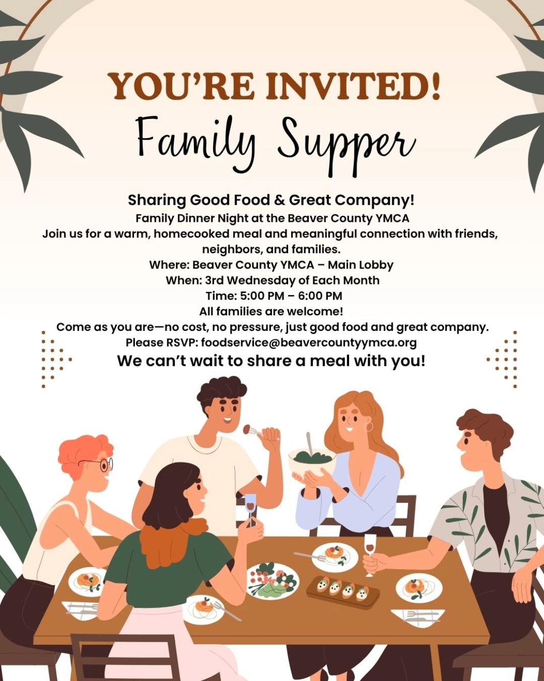 All Beaver County youth ages 18 or younger along with their families are are welcome to enjoy a home-cooked meal from 5:00-6:00 PM at the YMCA main lobby. Feel free to stop by after swimming, before a workout/child watch or after youth activities. The best memories are made when gathered around the table!